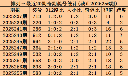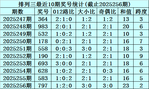 上期回顾:排列三2025256期奖号为797,奇偶比为3:0,大小比为3:0,跨度为23。