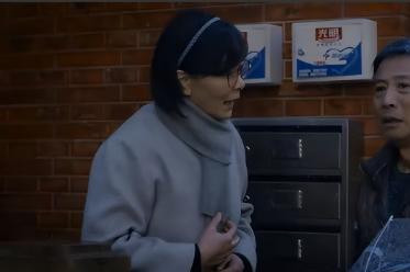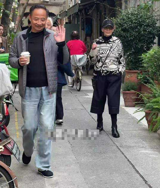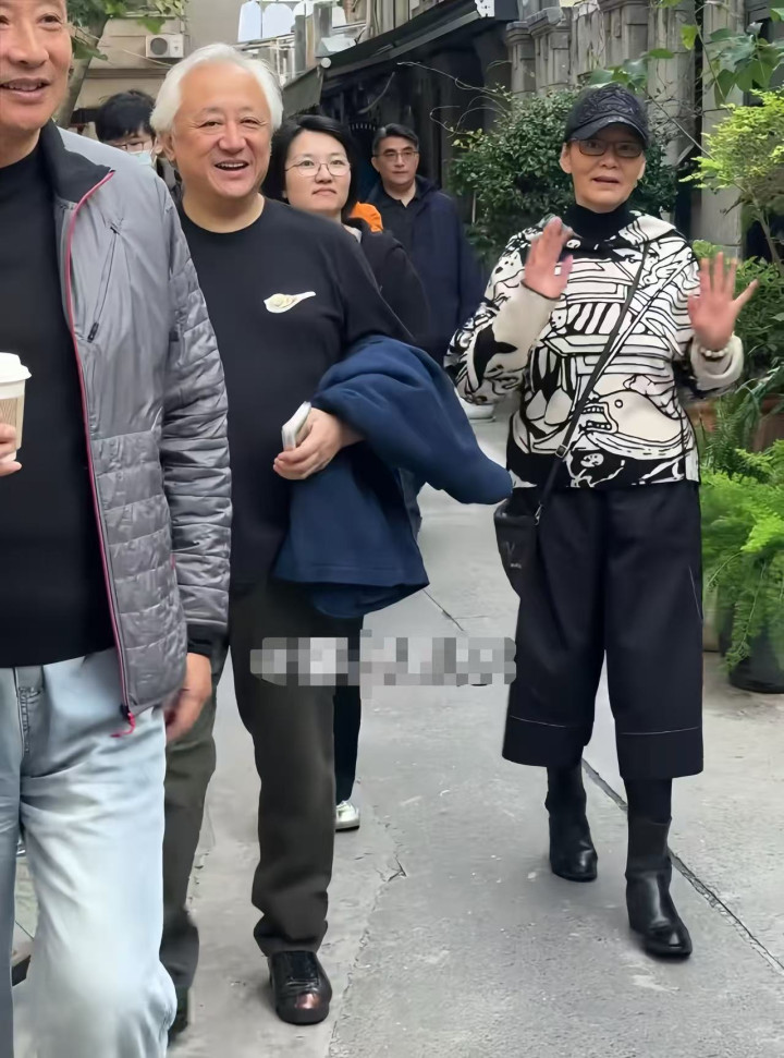 此时潘虹老师又换了一身穿搭,她单手插兜看着还有点酷,看到居民微笑摆手回应,看着好亲切。