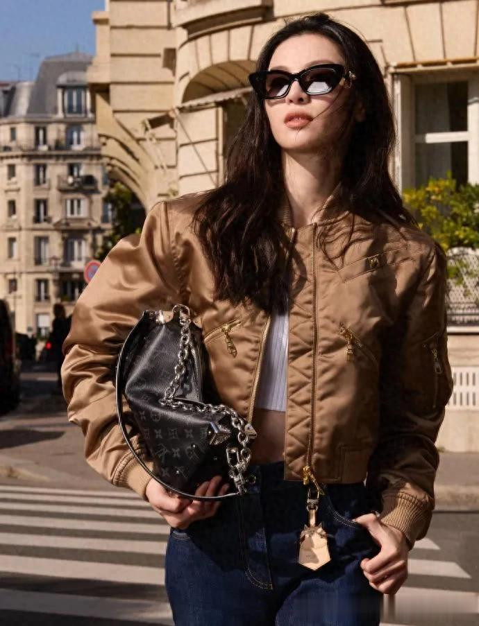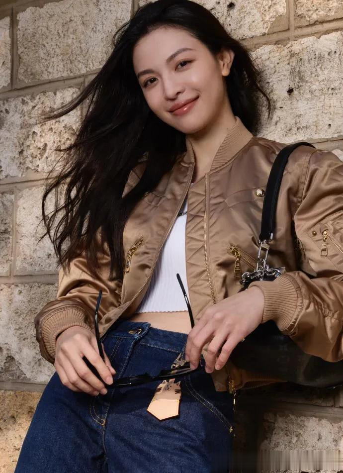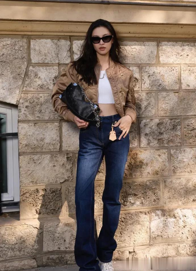 > 钟楚曦的衣品真是出挑! 棕色夹克+白背心+牛仔裤, 时髦又洋气
