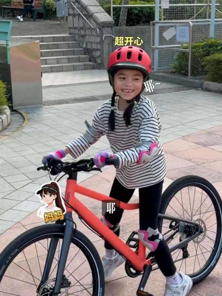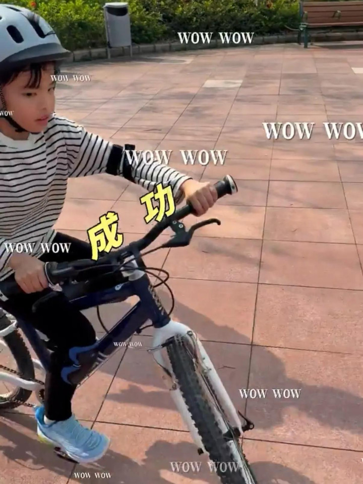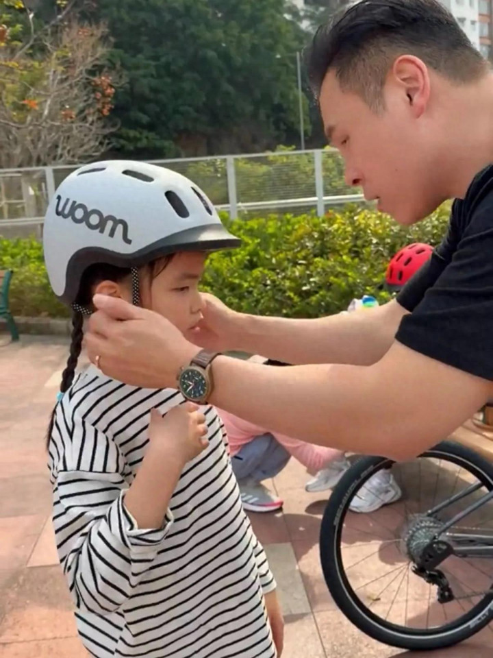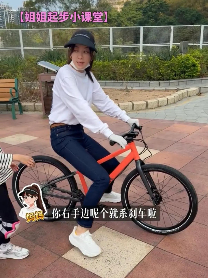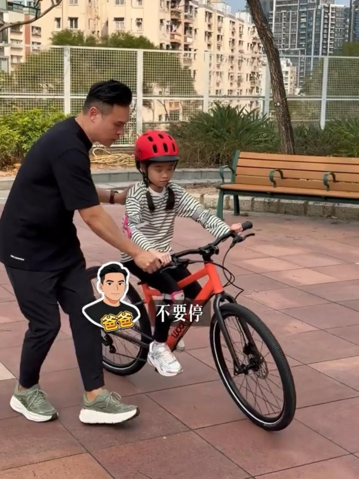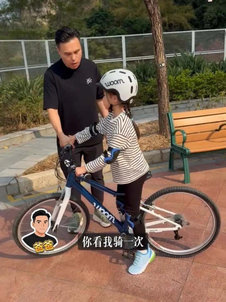 熊黛林为女儿们准备的是没有辅助轮的自行车,而且车架也比较高,但对于个子高挑的俩女儿来说也能驾驭。熊黛林还亲自给女儿们做了示范,教女儿如何起步和刹车,郭可颂更是全程扶着女儿,夫妇二人都超级有耐心。