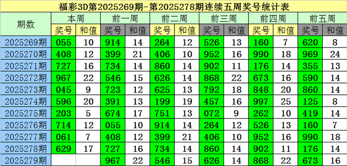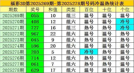 上期回顾:福彩3D第2025278期开奖奖号为:629,奖号类型为:组六,奖号冷温热态为:温号+温号+温号。