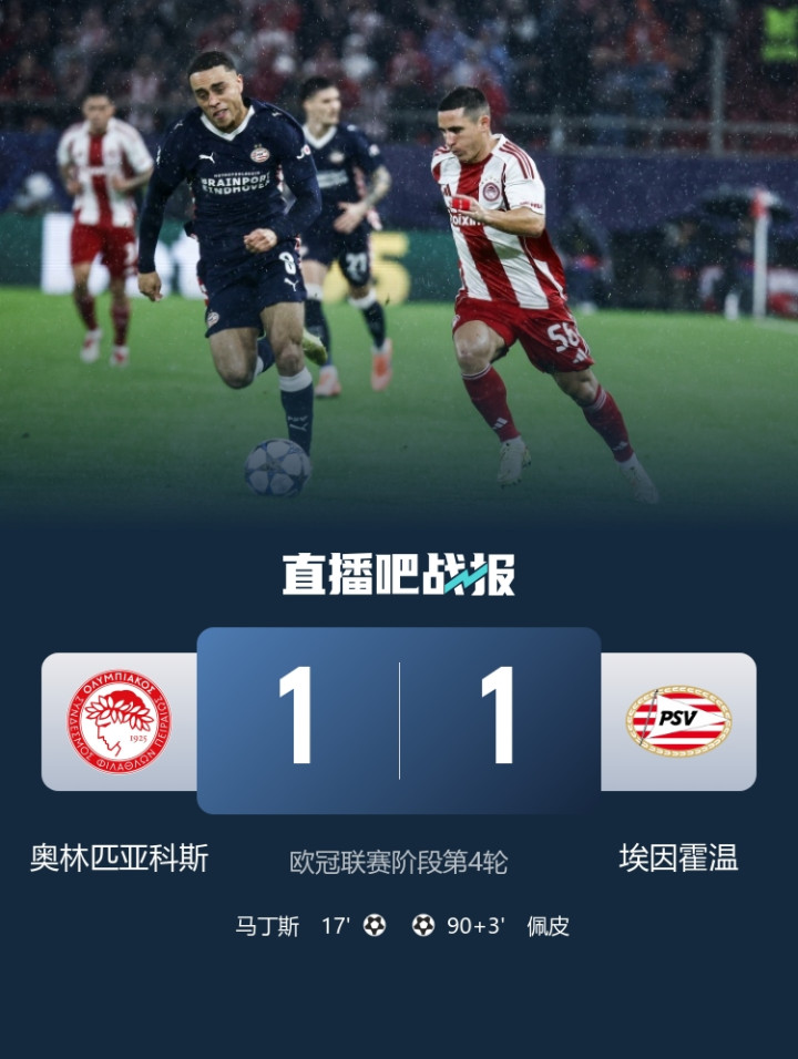 直播吧11月5日讯北京时间11月5日04:00,欧冠联赛阶段第四轮奥林匹亚科斯迎战埃因霍温的比赛在卡莱斯卡基斯体育场进行,上半场奇奎尼奥禁区倒地未判罚,随后奇奎尼奥助攻马丁斯爆射破门首开记录,下半场佩皮补时抽射绝平,最终奥林匹亚科斯1-1埃因霍温无缘欧冠首胜。