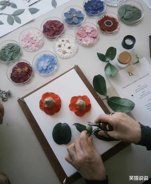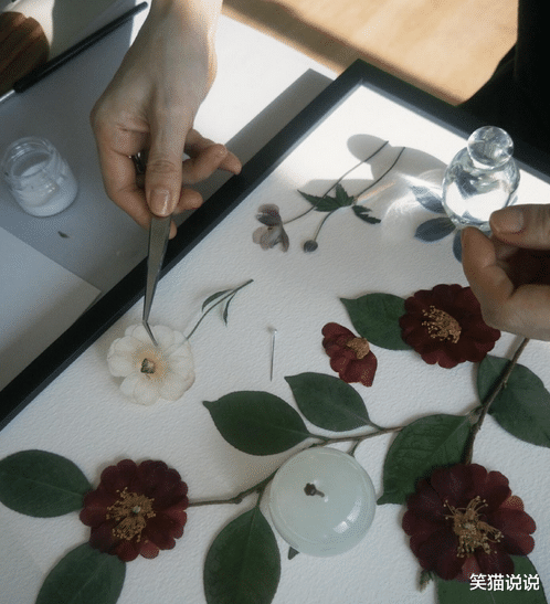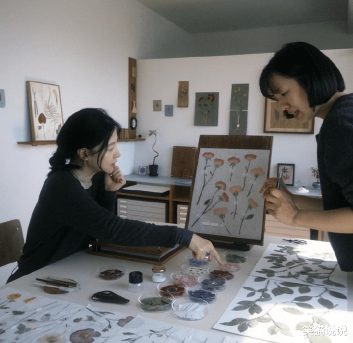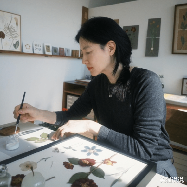 李英爱还晒出了她在制作干花画的过程的照片,她很认真地处理着每一个细节,神态十分平静温和,整个过程都很安静。