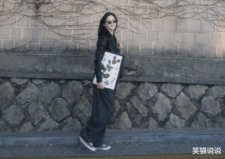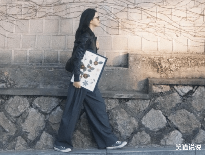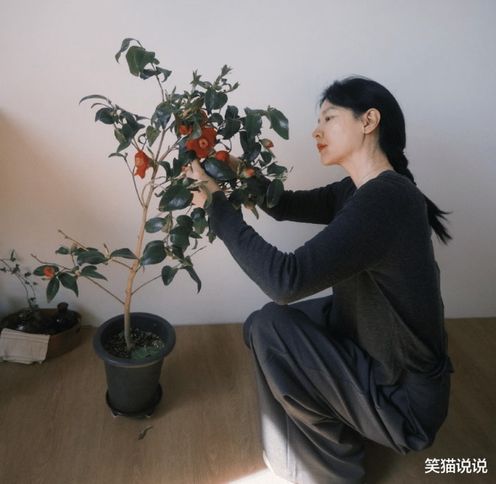 在照片中可以看到李英爱穿着黑色的贴身上衣搭配宽松的深灰色长裤,她扎着麻花辫,看起来很文艺又很温柔。李英爱蹲在地上,一脸认真地在整理一盆山茶花,这画面看起来很唯美,又略带几分文艺气息。