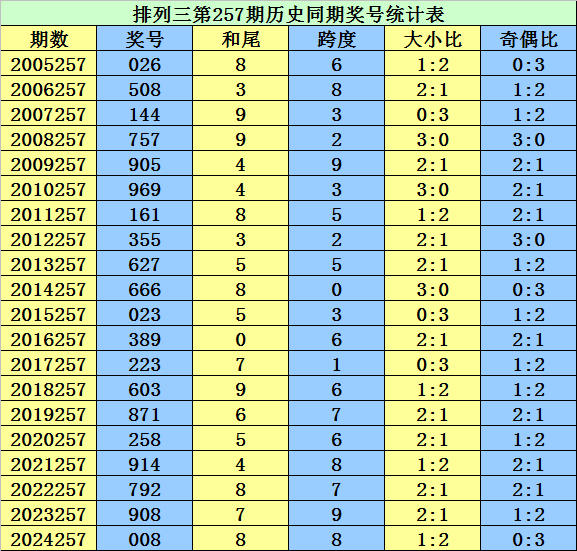 历年第257期排列三同期奖号开出:026、508、144、757、905、969、161、355、627、666、023、389、223、603、871、258、914、792、908、008。