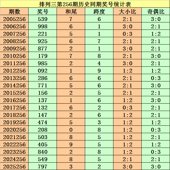 奇偶比参考:在第257期排列三历史同期中,奖号奇偶比1:2→8期,2:1→7期,0:3→3期,3:0→2期,其中奇偶号码总比例开出28:32,偶数开出较多,本期看好偶数热出,奇偶比参考1:2。